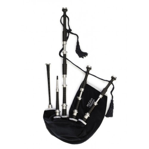 African Blackwood with poly pipe chanter, fully beaded and combed, all engraved ALUMINUM mounts, ferrules, slides and ring caps. Available in Celtic Thistle, Zoomorphic or Victorian Scroll patterns.