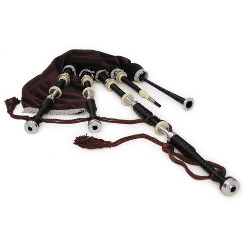 African Blackwood with poly pipe chanter, fully beaded and combed, imitation ivory projecting mounts, engraved nickel ferrules, slides and ring caps, plus inlaid engraved plate.  Available in Celtic, Thistle, Zoomorphic or Victorian Scroll patterns.  Celtic Design shown.  Includes Bannatyne hide/synthetic pipe bag, cover, cords and synthetic drone reeds.